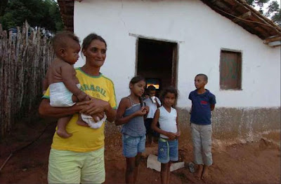 “Vem um pessoal de Belo Horizonte aqui e faz caridade. Deixam sempre uma cesta básica. Eles também ajudaram a fazer dois cômodos na minha casa”, conta Antônia. Os dois primeiros filhos, de 16 e 12 anos, são de um casamento já desfeito. Os outros cinco (9,7,5,2 anos e três meses de idade) são filhos do atual marido, Luiz Teixeira Salomão, de 79 anos. A renda do salário mínimo da aposentadoria de Luiz é que sustenta os sete filhos. Os outros oito filhos do primeiro casamento de Luiz não contam mais com a ajuda do pai, que com problemas de visão ficou impedido de fazer as cangaias (artefato usado nos burros para carregar lenha), antes usadas para complementar a renda.